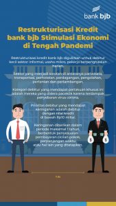 Sesuai imbauan OJK, bank akan senantiasa bersikap awas dan berhati-hati dalam menerapkan kebijakan demi menghindari dimanfaatkannya situasi ini oleh pihak-pihak yang tidak bertanggung jawab dengan pemberian restrukturisasi kepada nasabah bermasalah. bank bjb bakal bergerak proaktif membantu debiturnya dengan menawarkan skema restrukturisasi yang tepat, baik dari sisi jangka waktu, besaran cicilan ataupun relaksasi bunga.