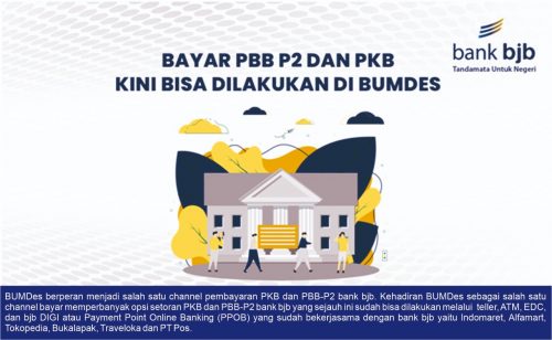 Dengan skema ini, BUMDes berperan menjadi salah satu channel pembayaran PKB dan PBB-P2 bank bjb. Kehadiran BUMDes sebagai salah satu channel bayar memperbanyak opsi setoran PKB dan PBB-P2 bank bjb yang sejauh ini sudah bisa dilakukan melalui Teller, ATM, EDC, dan bjb DIGI atau e-commerce dan modern channelyang sudah bekerjasama dengan bank bjb yaitu Indomaret, Alfamart, Tokopedia, Bukalapak, Traveloka dan PT Pos.