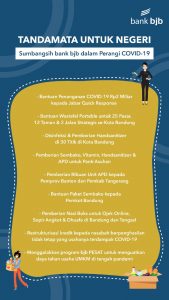 Karena itu, kerja sama antar pelbagai pihak harus terusdilakukan sebagai upaya penguatan. bank bjb mengajak kepada seluruh warga untuk terlibat aktif memberikan sumbangsih dalampercepatan penanganan COBID-19 ini sesuai dengan tugas dankapasitasnya masing-masing,” kata Direktur Utama bank bjb Yuddy Renaldi.