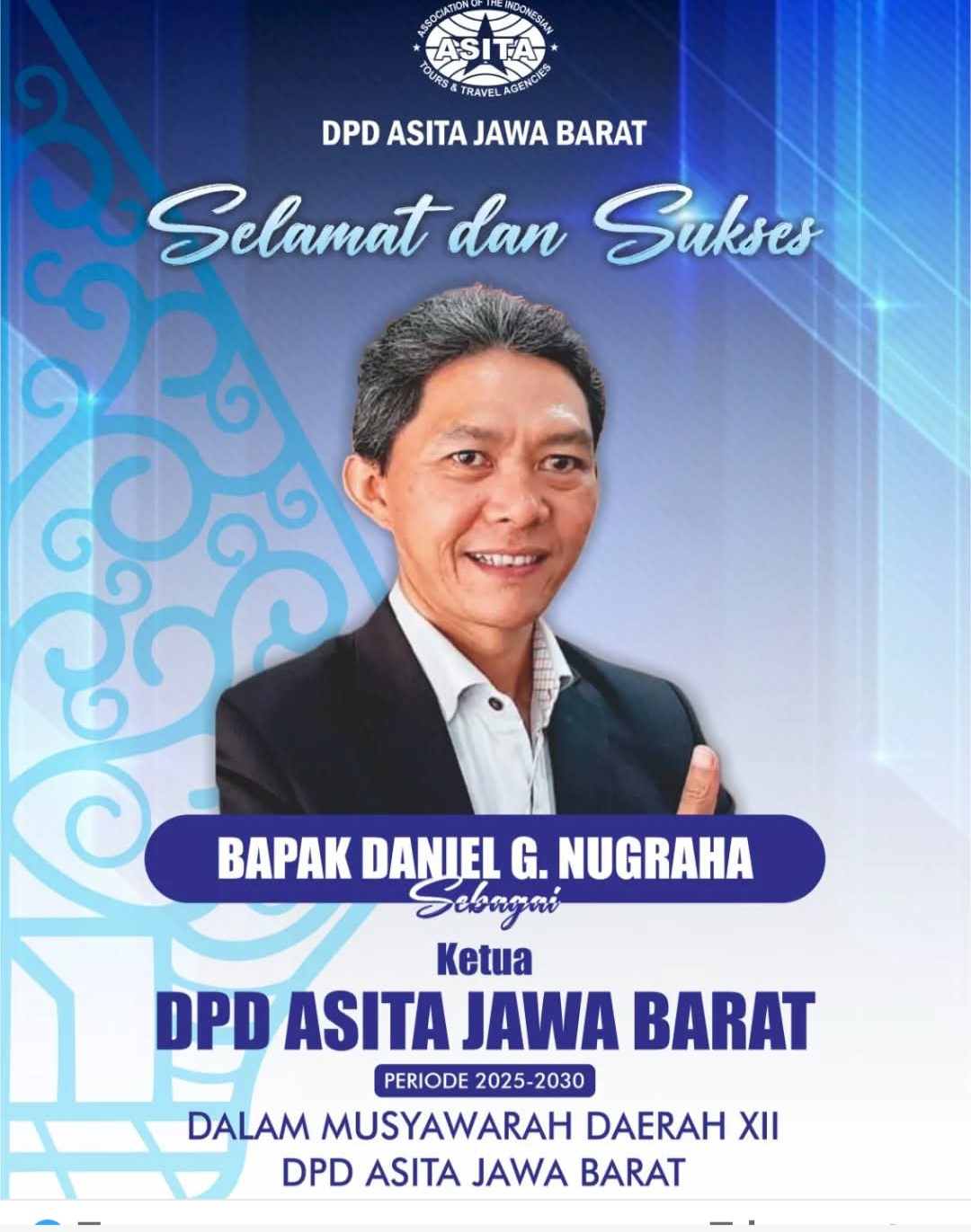 Jurnal7.com|Bandung – Daniel G Nugraha terpilih sebagai Ketua DPD Asita Jawa Barat Periode 2025 – 2030 menggantikan Ketua sebelumnya Budianto Ardiansyah dalam Forum Musyawarah Daerah XII Asita Jawa Barat 2025 di Hotel Aryaduta, Jumat (14/2/2025).