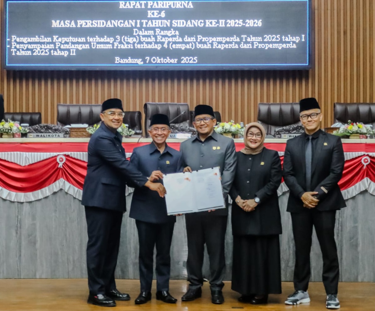 Jurnal7.com|Bandung – Tiga rancangan peraturan daerah (Raperda) resmi disetujui oleh Dewan Perwakilan Rakyat Daerah (DPRD) Kota Bandung dalam Rapat Paripurna ke-6 Masa Persidangan II Tahun Sidang 2025–2026, di Ruang Rapat Paripurna DPRD Kota Bandung, Jalan Sukabumi, Selasa, 7 Oktober 2025.