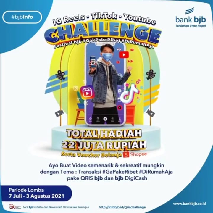 Syaratnya mudah, Anda dapat mengunggah video kreatif Anda ke tiga platform tersebut dengan tema “Transaksi #GakPakeRibet #DiRumahAja pakai QRIS bjb dan bjb DigiCash”. Video menggambarkan kemudahan bertransaksi secara digital tanpa harus beranjak dari rumah menggunakan QRIS bjb dan bjb DigiCash dalam durasi maksimal lima menit. Video yang diunggah harus disertai tagar #bankbjb #QRISbjb #QRISbjbChallenge #bjbDigiCash #bjbDIGI. Juga mention akun Instagram atau Youtube bank bjb.