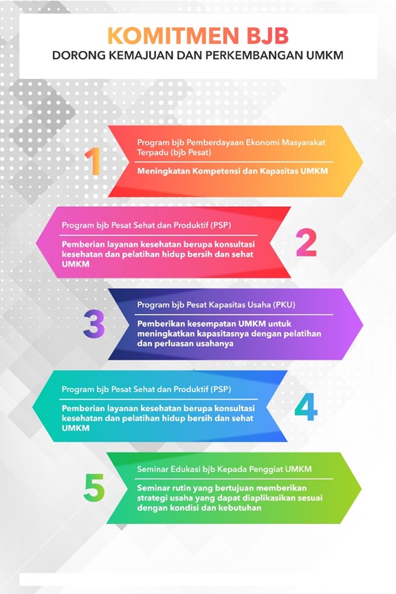 Wujud nyata dukungan penuh terhadap UMKM oleh bank bjb dapat terlihat dari program bjb Pesat alias program Pemberdayaan Ekonomi Masyarakat Terpadu. Program yang diluncurkan pada 2015 ini ditujukan untuk meningkatkan kompetensidan kapasitas usaha bagi pelaku usaha. Dengan harapan bukan saja memberikanpermodalan melainkan juga pendampingan agar UMKM semakin maju dan berkembang.