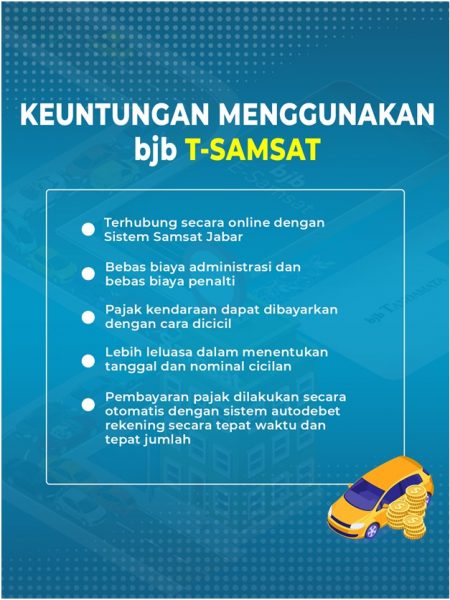 Beruntung bjb memiliki layanan Tabungan Samsat atau lebih dikenal dengan sebutan bjb T-Samsat yang memungkinkan pemilik kendaraan bermotor bisa membayar PKB dengan cara dicicil. bjb T-Samsat terselenggara berkat kerja sama bank bjb dengan Tim Pembina Samsat Provinsi Jawa Barat.