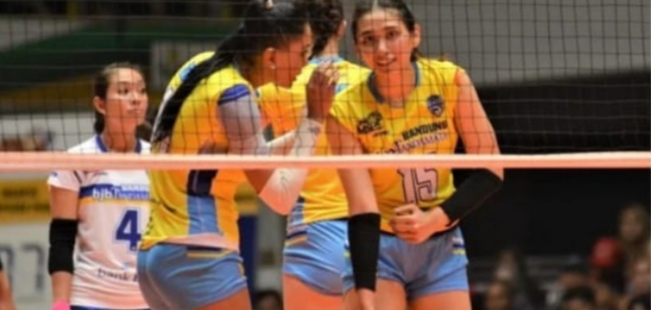 Tim voli putri Bandung bjb Tandamata tampil gemilang dengan mengalahkan Jakarta PGN Popsivo Polwan, Kompetisi Proliga 2020, putaran kedua di GOR Tri Darma Gresik, Jawa Timur, Sabtu (29/2/2020). Bandung bjb Tandamata menang tiga set langsung, 25-18, 25-17, dan set terakhir 27-25. Kemenangan ini sekaligus revans atas pertemuan pertama di mana Popsivo Polwan unggul 3-1.