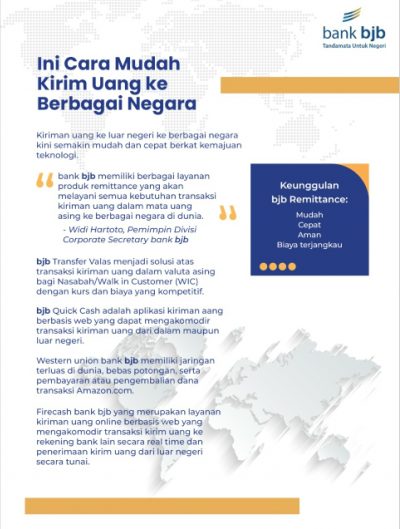 “bjb Remittance memberikan kemudahan transaksi mata uang asing kemanapun tujuannya di berbagai belahan dunia dengan persyaratan yang mudah,” ujar Widi.